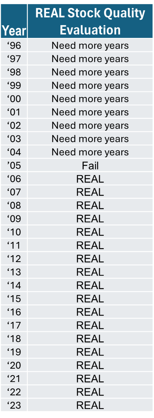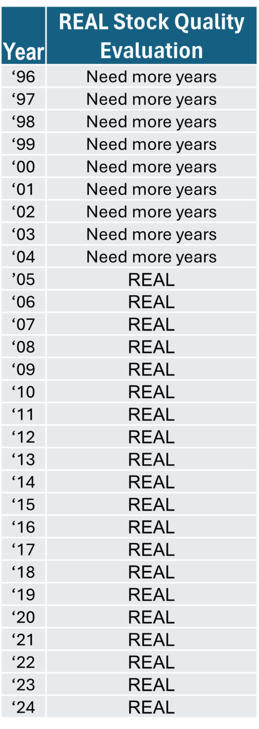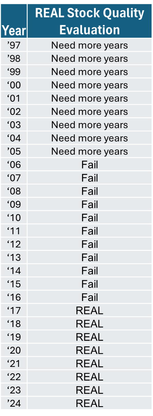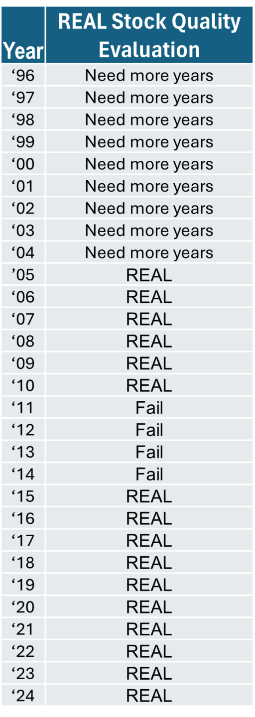 - Subsequently, the stock was re-evaluated each year to see if it still met REAL Stock quality criteria