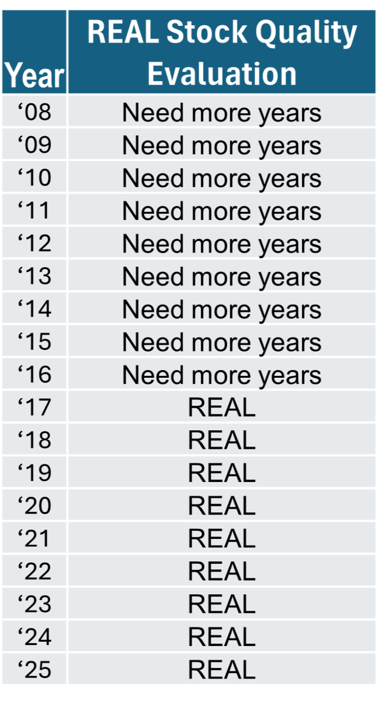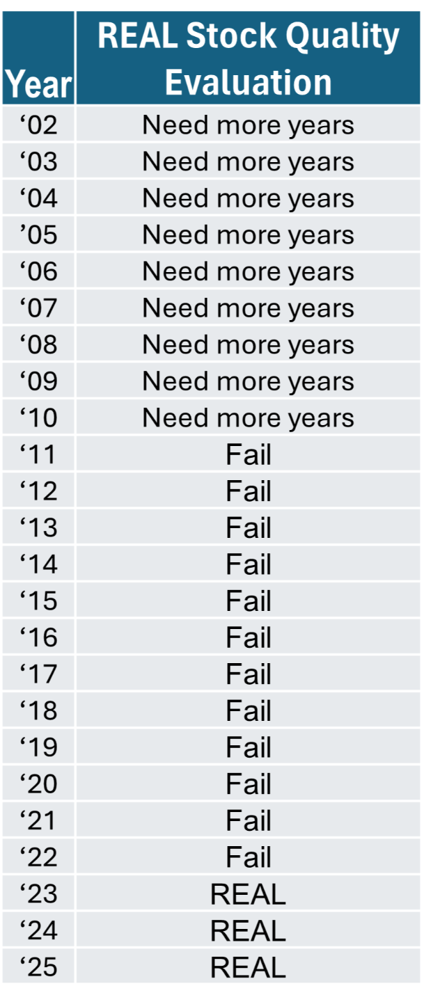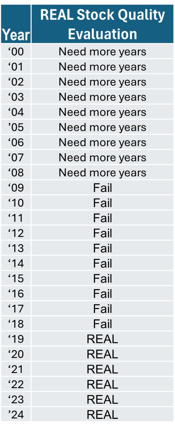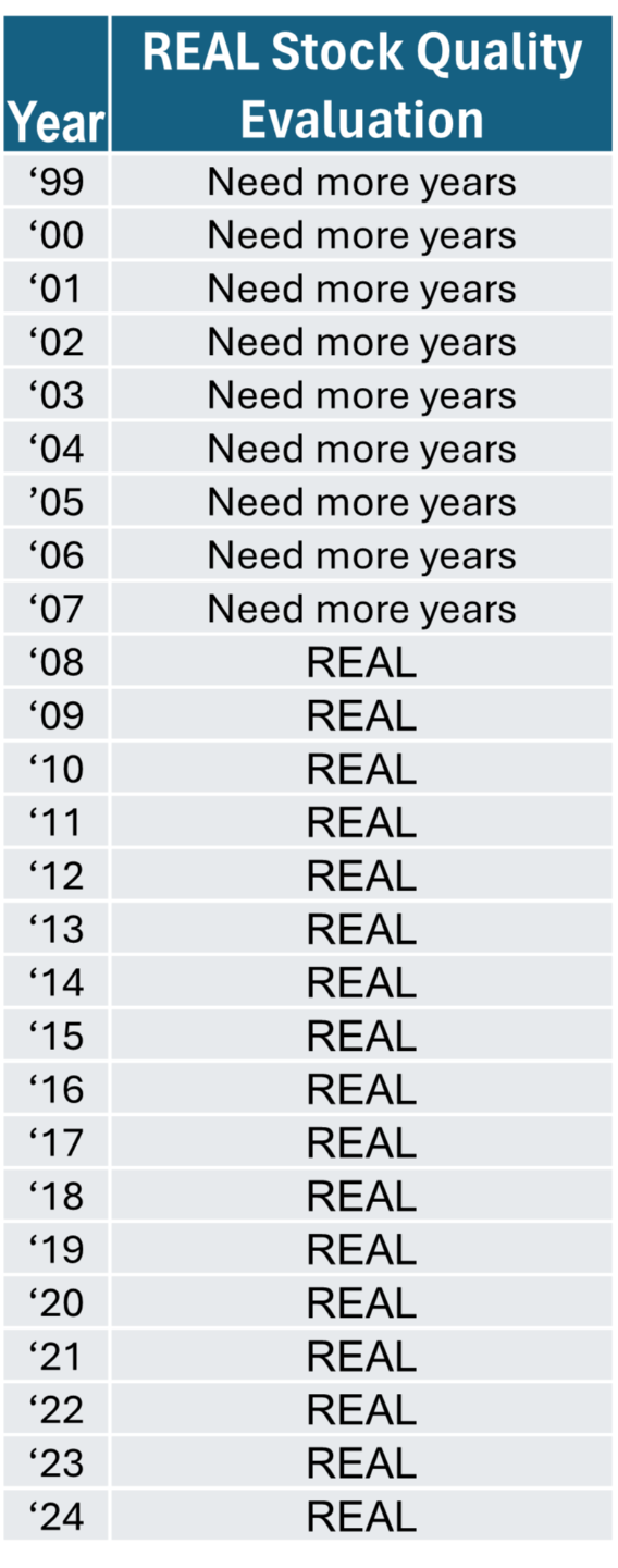 - Subsequently, the stock was re-evaluated each year to see if it still met REAL Stock quality criteria
