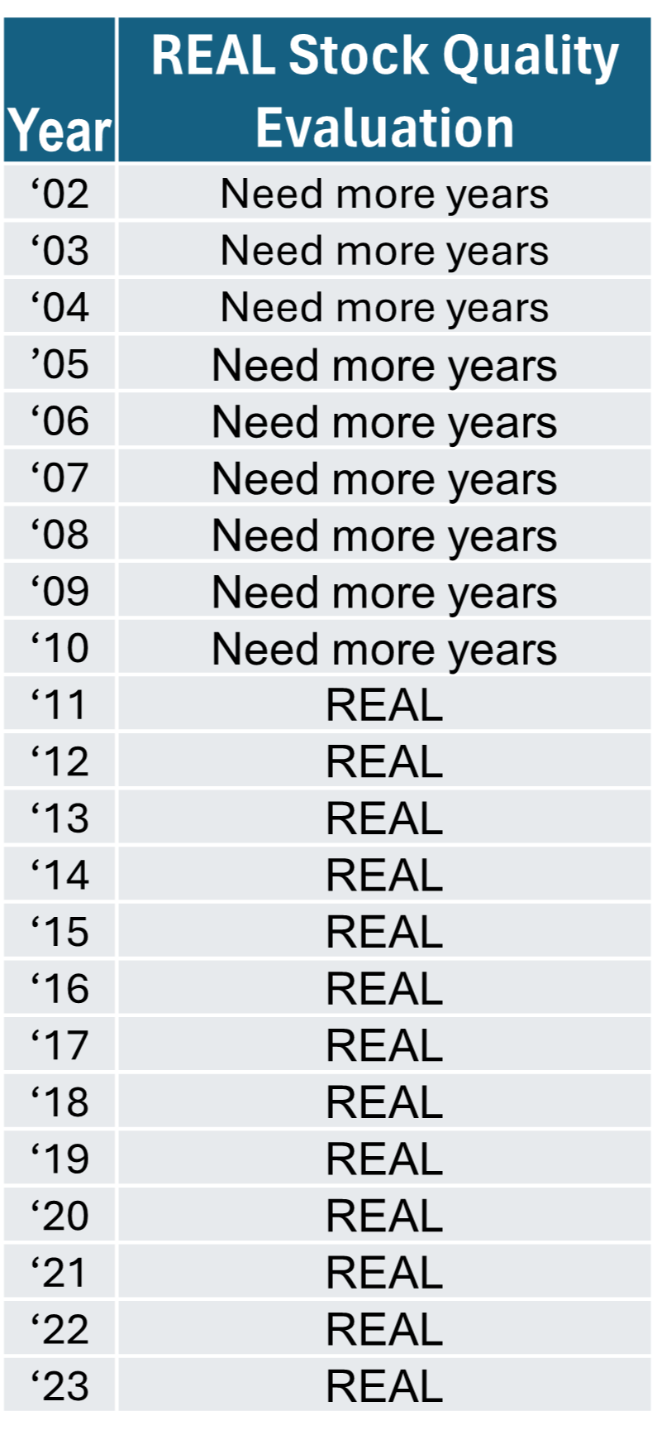 - The oldest 10 years of financial data were used to determine if the stock met REAL Stock quality criteria initially for the 10th oldest year